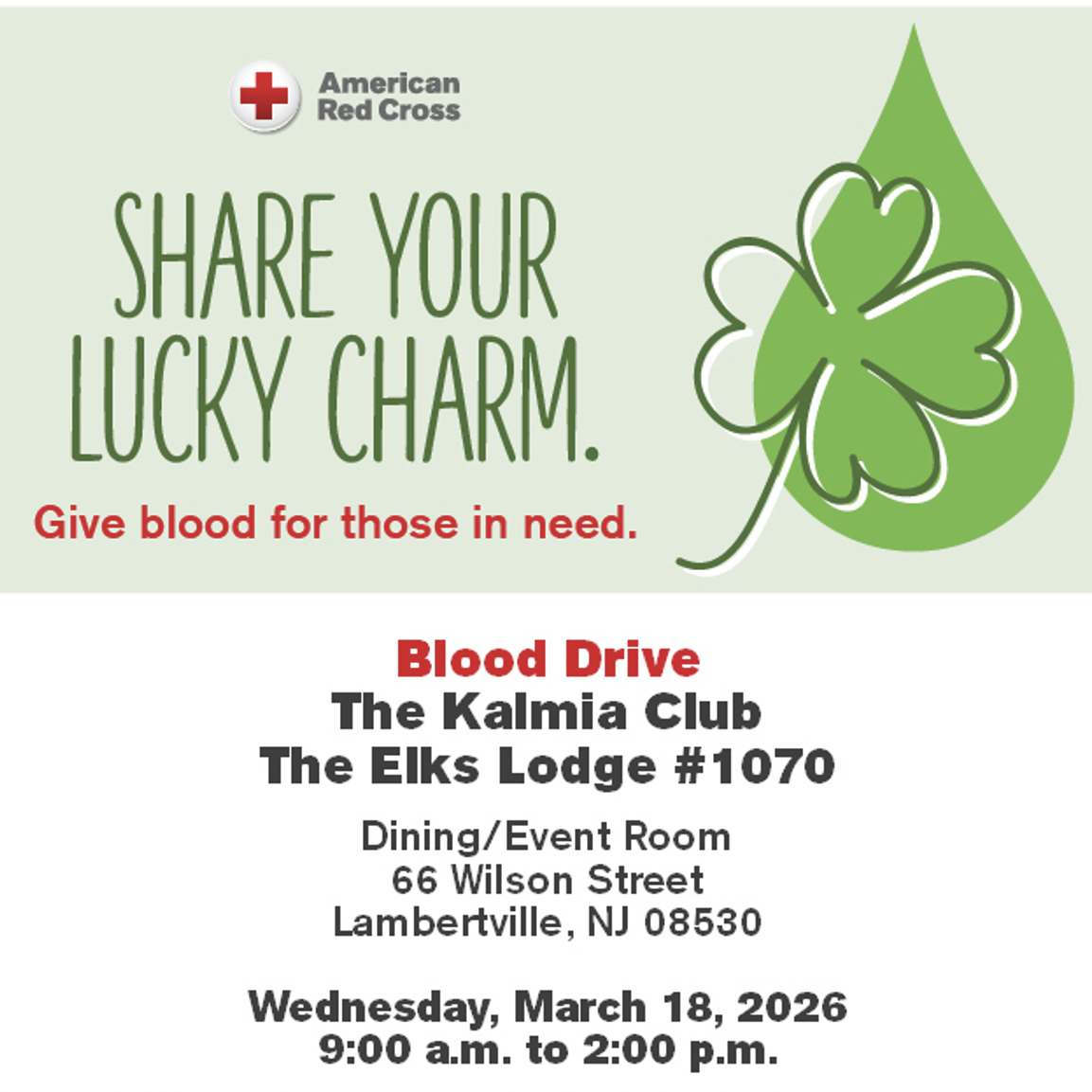 The Kalmia Club blood drive, in partnership with the American Red Cross, sponsored a community-wide blood drive at the Elks Lodge in Lambertville on May 2, 2023. redcross.org