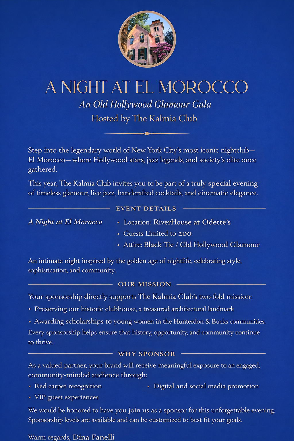 The event will take place at River House at Odette’s and welcome 200 guests for a night of vintage glamour, live jazz, cocktails, dinner, and classic Hollywood style—all in support of our mission which is twofold: awarding scholarships to young women in the Hunterdon/Bucks communities and preserving the integrity of our clubhouse which is a historical landmark.